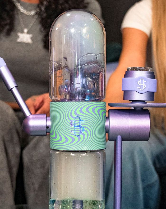 Fill with water through the hole in the body into the lower globe up to the visible shoulder of the glass. Attach the top globe, turn until just snug. Add material to your smoking bowl. Rotate the unit almost all the way and then ignite your material. When water starts to drain, smoke will be pulled into the top globe. When all water has been drained through the device, you can pull from the unit or rotate again to have all of the smoke push out to you for a contactless experience.